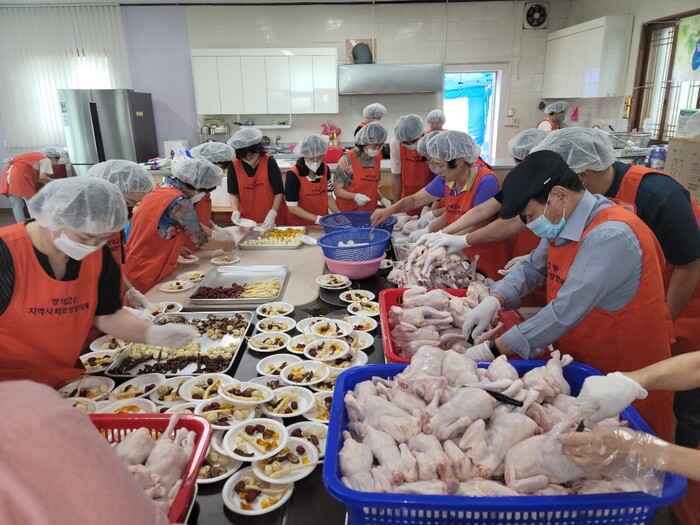 ▲영덕2동 협의체 위원들이 삼계탕 재료를 직접 손질하고 있다. 용인시 제공 |