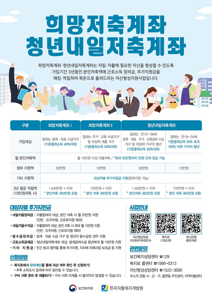 다만, 기초생활수급자 및 차상위계층(기준 중위소득 50% 이하)에 속하는 청년일 경우 현재 근로 중인 만 15세~39세 미만이 가입 대상이며, 3년 만기 시 최대 1,440만원(본인저축액 360만원 포함)과 예금이자를 받을 수 있다.