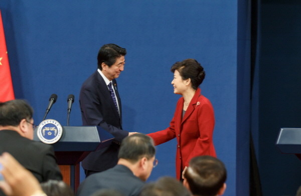 ▲ 박근혜 대통령과 아베 신조 일본 총리가 지난 1일 오후 청와대 춘추관에서 열린 공동기자회견에 앞서 악수하고 있다.<사진출처=청와대 홈페이지> |