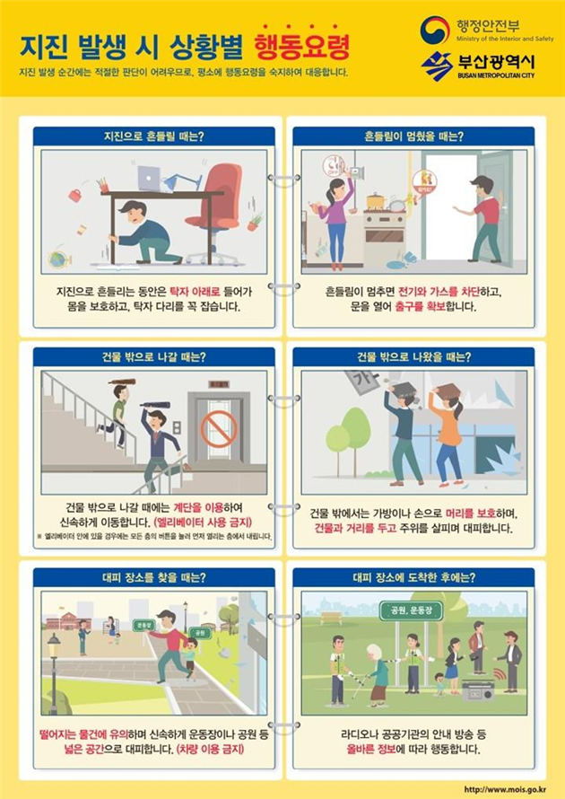 자세한 지진 시민행동요령은 부산시 누리집과 공식 사회관계망서비스(SNS)를 통해 확인할 수 있다.