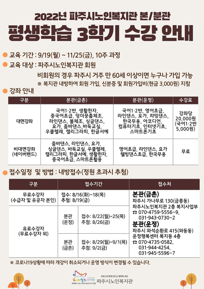 비대면 강좌는 정원 제한이 없으며, 대면 강좌는 각 강좌별 수강생이 상이하므로 자세한 사항은 파주시노인복지관 홈페이지에서 확인하거나 파주시노인복지관 담당자에게 문의하면 된다.