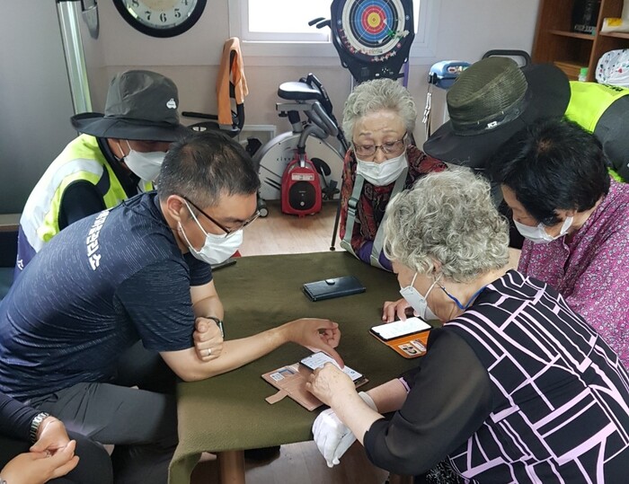 ▲행궁동 경기행복마을관리소 관계자가 경로당을 찾아 어르신들에게 스마트폰 보안에 대해 설명하고 있다. 수원시 제공 |