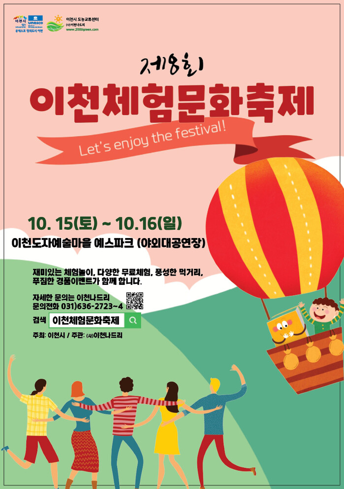 ‘100가지 체험! 100가지 웃음!’을 주제로 한 이번 체험문화축제는 10월 15~ 16일, 2일간 이천도자예술마을 예스파크 야외 대공연장 일원에서 개최하며, 3년 만에 개최한 만큼 다양한 체험프로그램과 공연들이 가득 준비되어 있다.