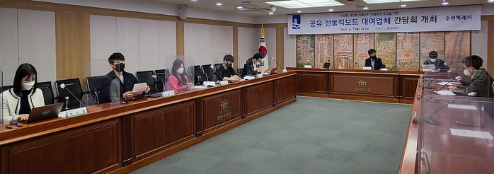 ▲지난 7일 시청 상황실에서 열린 ‘공유 전동킥보드 대여업체 간담회’ 모습. 수원시 제공 |