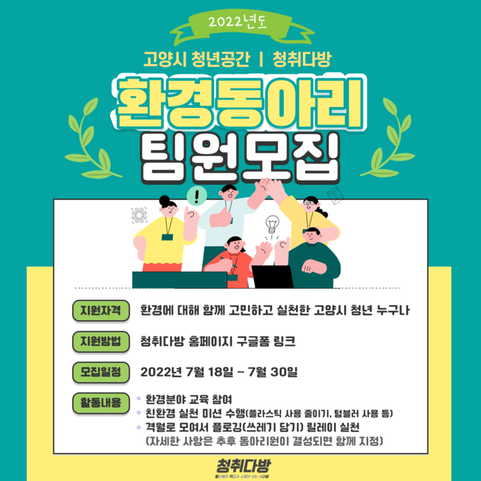 [로컬세계 = 이영원 기자]경기 고양특례시(시장 이동환) 청년공간 청취다방이 ‘청년 환경동아리’에 참여할 동아리 회원을 오는 30일까지 공개 모집한다.