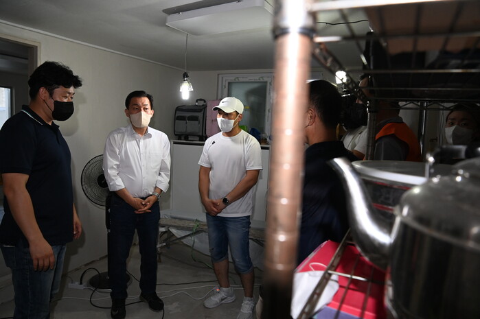 ▲지난 20일 이재준 수원시장(왼쪽 두 번째)이 수원지역 침수 가구 현장을 방문해 집수리 봉사를 하고 있는 문상철 희망둥지협동조합 대표(왼쪽)를 격려하고 있다. |