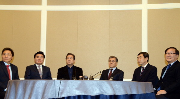 ▲ 새누리당 김무성 대표와 원유철 원내대표, 새정치민주연합 문재인 대표와 이종걸 원내대표는 지난 6일 여의도 국회 귀빈식당에서 국회 정개특위 여야 간사인 새누리당 이학재, 새정치민주연합 김태년 의원과 함께 선거구 획 정기준 마련을 위한 담판 회동을 가졌다.<사진출처=새정치민주연합 홈페이지> |