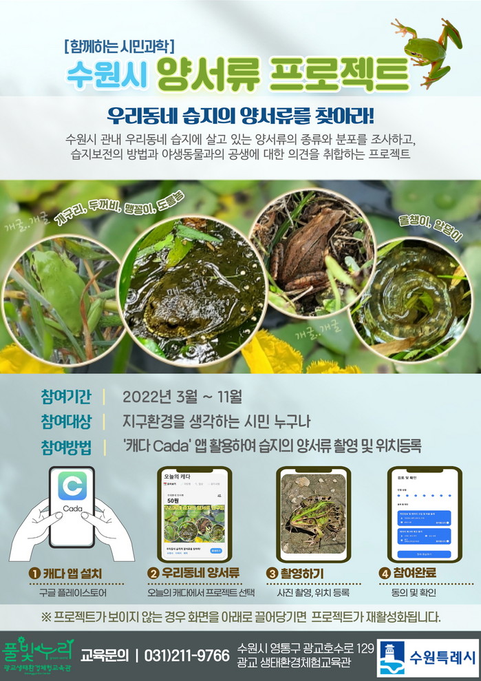 스마트폰에 데이터 수집 플랫폼인 ‘캐다’앱(앱스토어, 플레이스토어에서 ‘캐다’ 검색)을 설치한 후 수원시 습지에 살고 있는 양서류를 자연 상태 그대로 촬영해 앱에서 ‘우리동네 양서류’ 프로젝트를 선택해 등록하면 된다. 양서류를 손으로 만지거나 채집해서는 안 된다. 누구나 참여할 수 있다.