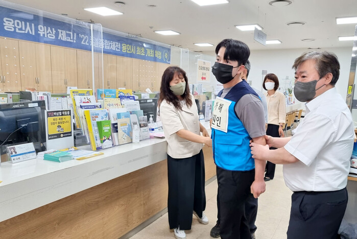 ▲폭언·폭행 등 특이민원 발생에 대비한 모의훈련 모습. 용인시 제공 |