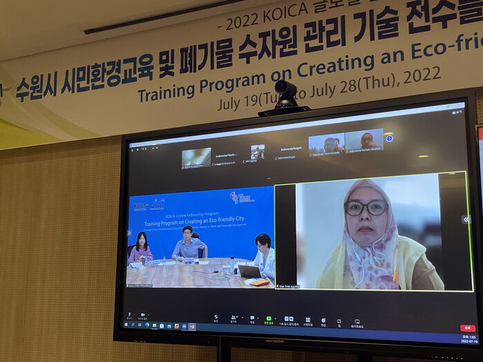 수원시 환경 분야 전문가가 수원컨벤션센터 화상회의실에서 인도네시아(서자바주, 동자바주, 방카벨리퉁주 등) 공무원 18명을 대상으로 비대면(화상회의 프로그램) 연수를 진행한다. 지난 19일 시작했고, 28일까지 8회에 걸쳐 운영한다.