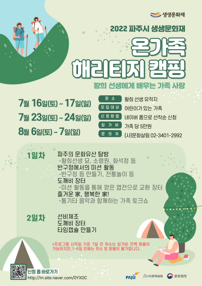 3개 사업은 ▲행아웃위드방촌 ▲파주 혜음원지, 고려를 보고 듣고 만지다 ▲율곡코드로, ‘행아웃 위드 방촌’ 사업은 황희 선생 유적지에서 ‘온가족 해리티지 캠핑’을 진행하며, 문화유산 탐방, 반구정에서의 미션활동, 도깨비장터, 가족토크쇼가 진행된다.
