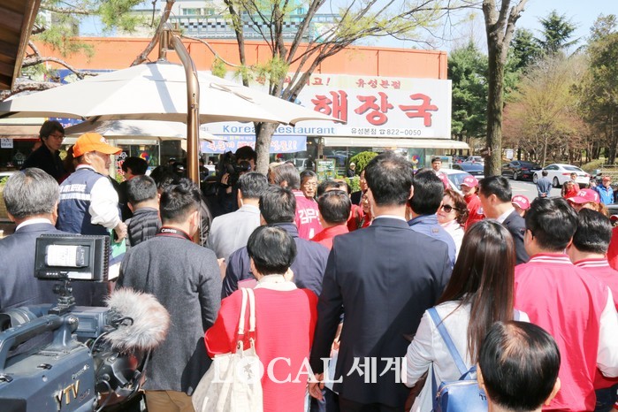 ▲5일 대전에서 지원유세를 벌이는 새누리당 김무성 대표를 보기 위해 지지자들과 시민들이 모여들고 있다. 오영균 기자. |