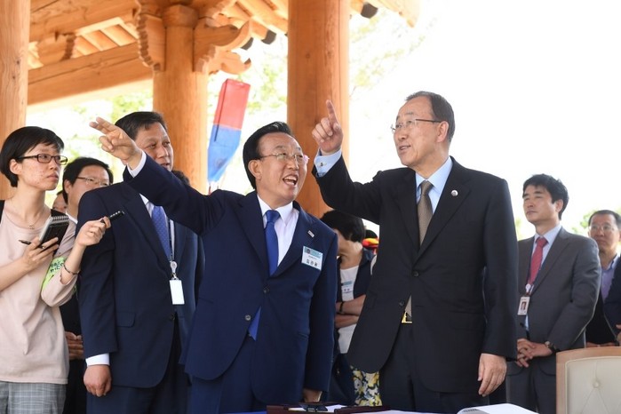 ▲반기문 UN 사무총장이 경북도청 신청사를 방문, 김관용 도지사와 환담을 나누고 있다. 경북도 제공. |