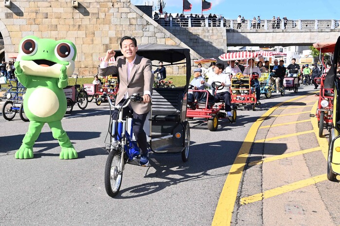 | ▲ 이재준 수원특례시장이 자전거를 타고 퍼레이드에 참여하고 있다. 수원시 제공 |