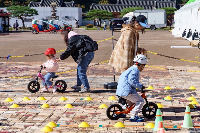 | ▲ 어린이들이 ‘생태교통 수원 뉴페스타’에서 자전거를 타고 있다. |
