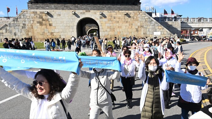 자동차가 사라진 거리에서 이번 행사의 슬로건 ‘걷GO, 타GO, 즐기GO~ 생태교통 수원’ 문구가 적힌 현수막을 든 대형 드론이 선두에서 행렬을 이끌었다.