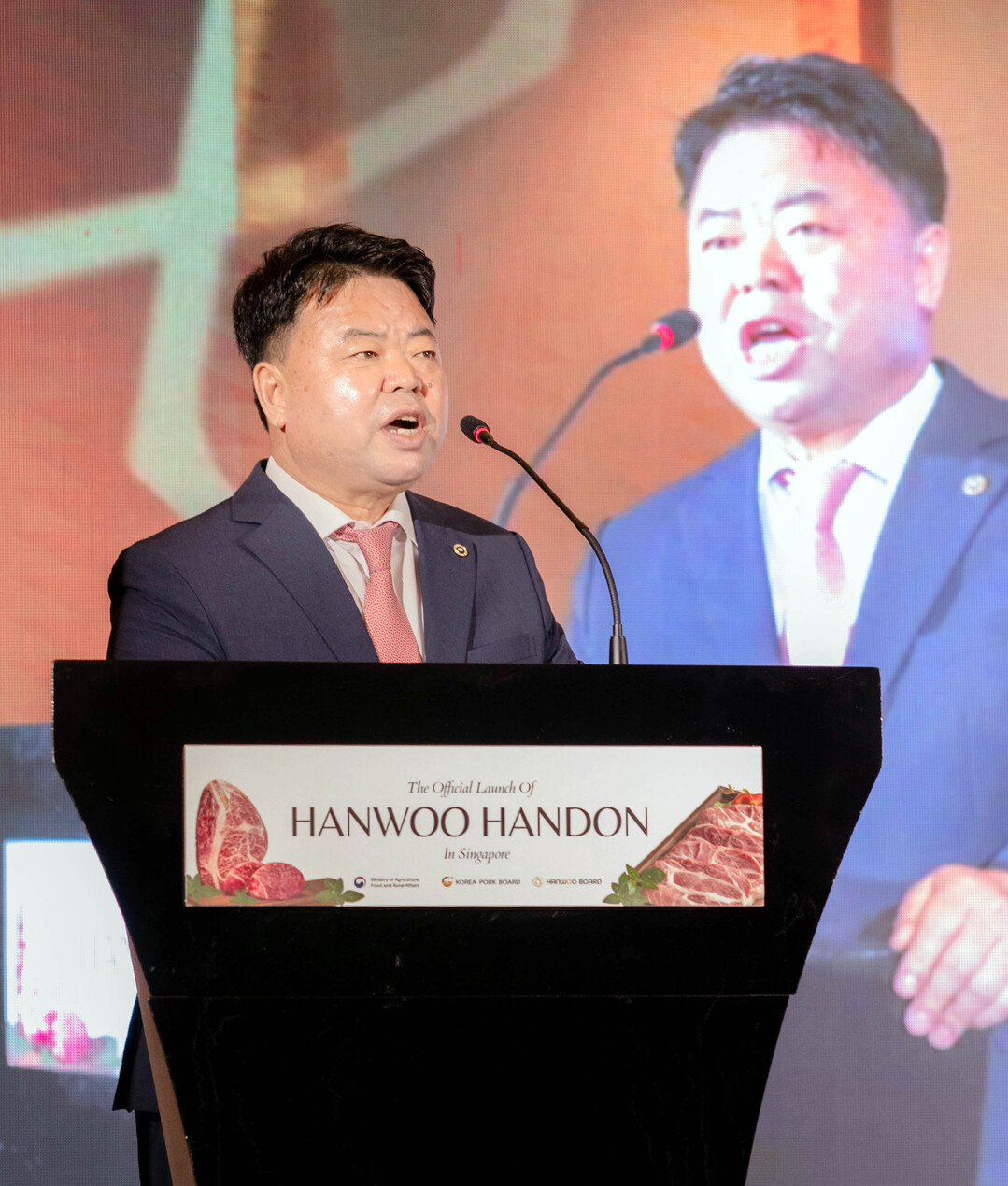 이기홍 한돈자조금관리위원회 위원장이 싱가포르 현지 무대에 올라 축사를 통해 한돈의 글로벌 경쟁력과 수출 비전을 강조하고 있다.