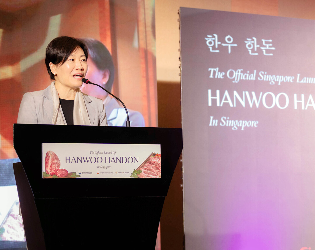 지난 1월 30일 ‘2026년 싱가포르 한우·한돈 수출 런칭행사’에서 송미령 농림축산식품부 장관이 기념사를 통해 한우·한돈 수출 런칭의 공식 시작을 알리고 있다.