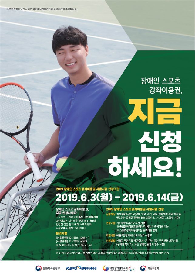 오는 6월 3~14일까지 시범사업에 참여하는 시·군·구청과 주민센터에서 장애인 스포츠강좌이용권 지원 신청 접수를 받는다. 신청 가능 지역은 스포츠강좌이용권 누리집(svoucher.kspo.or.kr)에서 안내하고 있다.