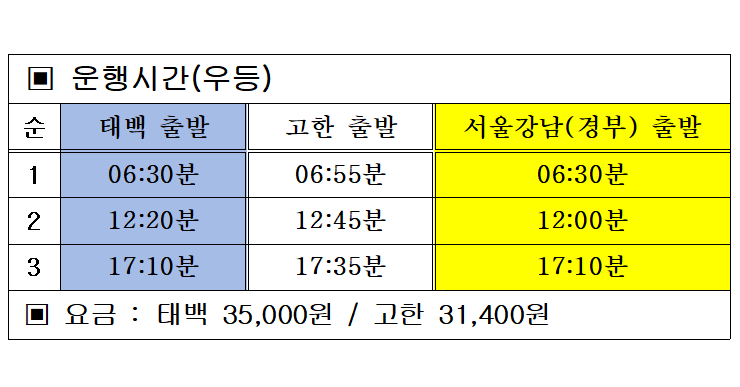 태백시 관계자는 “강남권과의 직통 연결로 수도권 접근성이 크게 개선될 것으로 기대된다”며 “앞으로도 관계기관과 협력해 교통서비스 개선을 지속적으로 추진하겠다”고 말했다.