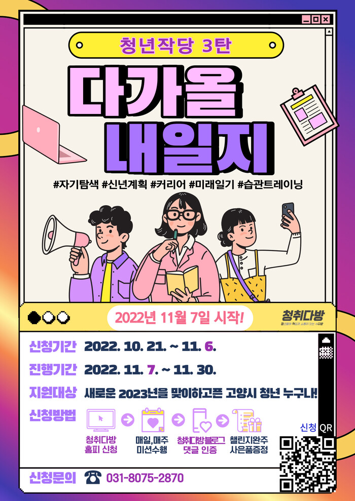 [로컬세계 = 이영원 기자]어느덧 2022년도 달력이 두 장 밖에 남지 않았다. 연초에 계획한 일이 제대로 이루어지지 않아 불안할 청년들을 위해 고양특례시는 청년작당 프로젝트 3탄 참여자를 모집한다.