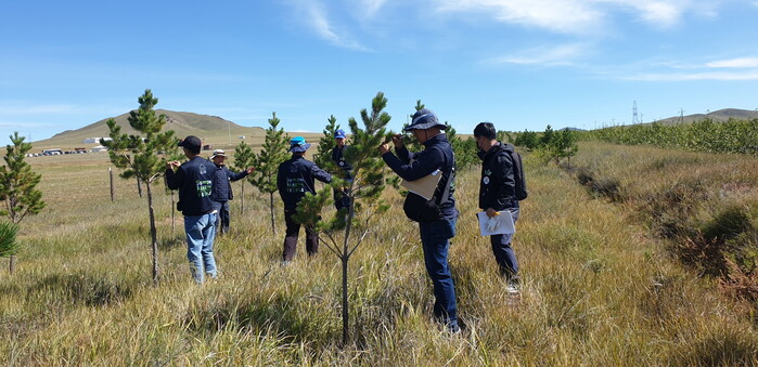 ▲수원시민봉사단이 ‘몽골 수원시민의 숲’에 있는 나무의 생육상태를 살펴보고 있다. 수원시 제공 |
