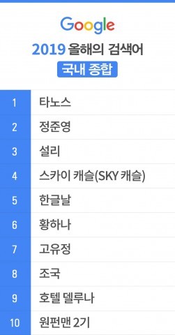 2019년 국내 인기 검색어 종합 순위는 △타노스 △정준영 △설리 △스카이캐슬(SKY 캐슬) △한글날 △황하나 △고유정 △조국 △호텔 델루나 △원펀맨 2기 순으로 나타났다.