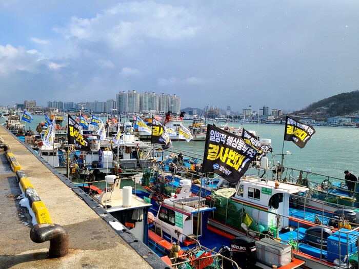 ▲ 전남 어업인들이 지난 2월 16일 목포신항에서 정부의 일방적인 해상풍력추진을 반대하는 해상 궐기대회를 열고 있다. 수협중앙회 제공 |