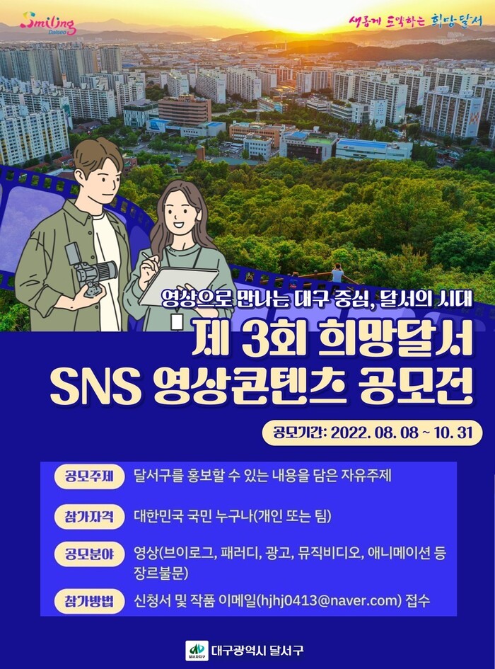 ‘제3회 희망달서 SNS 영상콘텐츠 공모전'은 과거와 현재, 또는 미래의 달서구 모습, 주요 정책(결혼친화, 스마트도시, 녹색힐링 등), 달서구민의 모습과 생활상, 달서구와 관련한 유쾌하고 감동이 있는 스토리를 담은 영상 등의 콘텐츠를 공모한다.