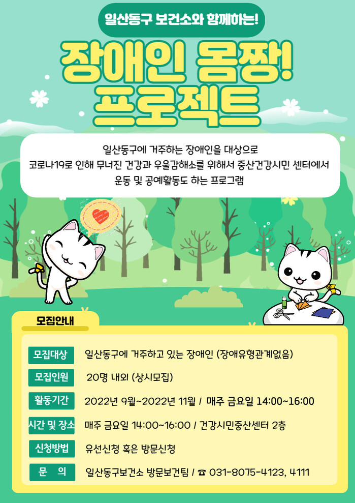 프로그램은 신체 체력 증진을 위한 운동 프로그램과 소근육 발달을 돕는 공예 프로그램이 병행된다. 고양시 일산동구에 거주하는 만70세 미만 재가장애인이라면 누구나 참여할 수 있다.