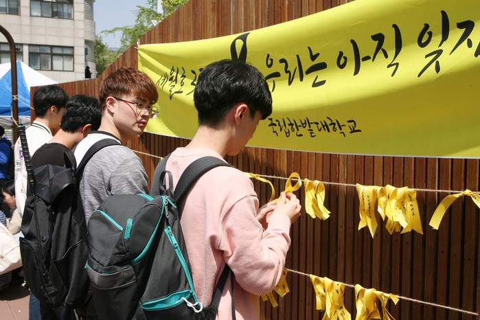 이날 추모행사는 한밭대 총학생회 주관으로 학회연합회, 총동아리연합회 임원과 학생 등 100여명이 참석했으며 희생자에 대한 묵념과 이동관 총학생회장의 추모사, 총동아리연합회에서 준비한 추모공연 순으로 진행됐다.