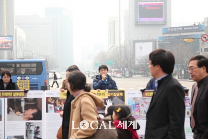 ▲가습기 살균제 피해자들이 서울 광화문광장에서 정부의 실질적인 대책 마련을 촉구하고 있는 가운데 지나가던 시민들이 피해사진을 바라보고 있다. 라안일 기자. |