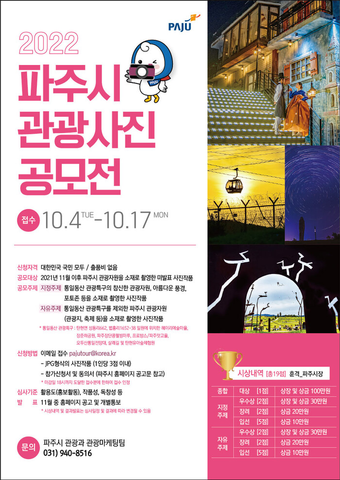 [로컬세계 = 이영원 기자]경기 파주시는 다양한 파주 관광지의 새로운 매력을 발굴하기 위해 ‘2022 파주시 관광사진 공모전’ 신청작품을 10월 4일부터 17일까지 접수받는다.