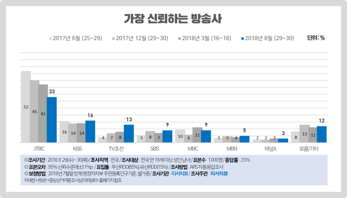 방송사 신뢰도는 JTBC가 직전 대비 9%p 하락한 33%로 계속 선두를 유지하는 가운데 뒤를 이어 ▲KBS 16%(↑2) ▲TV조선 13%(↑5) ▲SBS 9%(↑2) ▲MBC 9%(↓2) ▲MBN 5%(↑1) ▲채널A 3%(-)순으로 나타났다(괄호 안 수치는 2018년 3월 대비 등락폭).