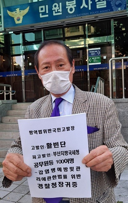 활빈단 홍정식 대표는 지난 4일 명예퇴임식을 한 직전 청장의 청내 전송과정에서 방역법을 위반한 채 100여명이 로비에 도열해 ‘황제 배웅’을 한 부산국세청 직원 전원에 대해 엄히 처벌해달라는 요지의 고발장을 경찰청 본청에 제출했다고 9일 밝혔다.