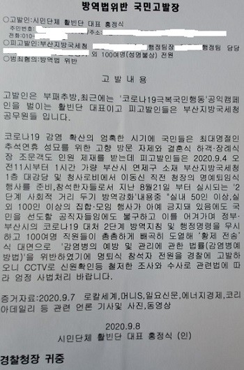 홍 대표는 특히 “피고발인들은 국민을 선도하고 모범을 보여야할 공무원들임에도 불구하고 관련 법을 어겨가며 중앙정부 및 부산시의 코로나19 대처 2단계 방역지침 및 행정명령을 무시하고 100여명이 실내에서 촘촘하게 빼곡히 도열해 ‘황제전송’ 식 대면으로 ‘감염병의 예방 및 관리에 관한 법률(감염병예방법)’을 위반하였기에 참석자 전원을 고발하니, 폐쇄회로(CC) TV를 통해 신원을 확인하는 등 철저한 수사로 관련 법에 따라 엄정하게 사법처리해 주시기 바란다”라고 강조했다.