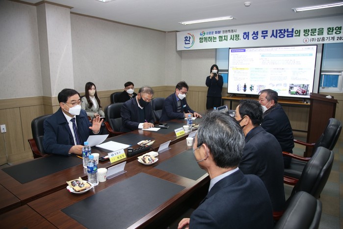 이날에는 허성무 시장을 포함한 김홍규 ㈜삼홍기계 대표, 김홍범 사장 및 임원진이 참석한 가운데, 사전환담, 회사소개, 원자력 관련품 및 핵융합발전설비, 진공챔버 생산공장 견학 순으로 진행됐다.