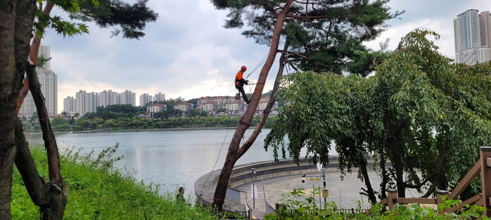 현장에 공사 차량이 진입할 수 없어 크고 높은 나무에 직접 올라가 작업을 하는 전문가인 아보리스트(수목관리사)가 수목 제거·강전지 작업을 했다.