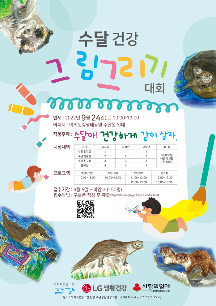 LG생활건강과 사회복지공동모금회가 후원하고, 사회적협동조합 한강이 주최하는 이번 대회는 서울 영등포구 여의샛강생태공원 일대에서 24일 오전 10시부터 오후 1시까지 진행된다. ‘수달아! 건강하게 같이 살자’를 주제로 수달 가족과 서식지, 생태 환경 등의 다양한 모습을 현장에서 그림에 담아내면 된다.