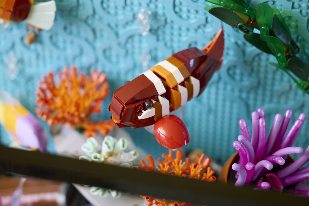 제품의 각 요소는 자유롭게 배치해 나만의 수족관으로 꾸밀 수 있다. 레인보우피쉬와 엔젤피쉬를 포함한 물고기 네 마리와 다양한 수초, 산호, 진주를 품은 조개 등 사실적인 레고 해양 생물이 어우러진 생태계를 구성할 수 있으며, 공기 방울까지 표현 가능하다.