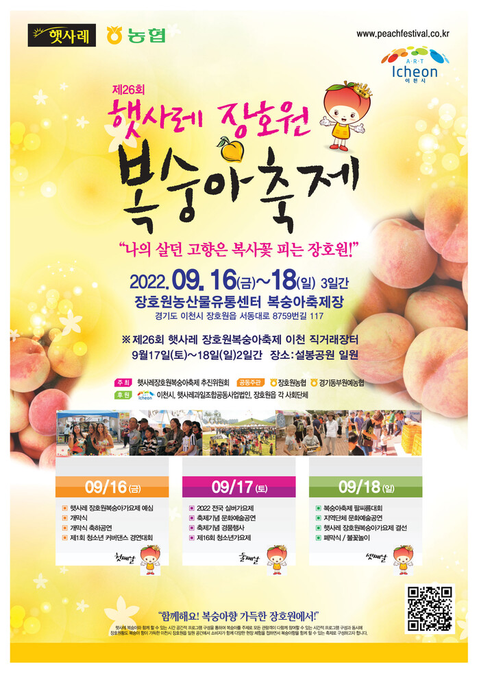 풍부한 햇살을 받고 탐스럽게 영글어진 명품 햇사레복숭아와 이천의 우수한 농경문화가 맛있게 어우러지는 최고의 과일 축제, 제 26회 햇사레 장호원 복숭아 축제를 제대로 경험하기 위해서는 직접 보고 느끼고 맛보는 방법이 최선이다.