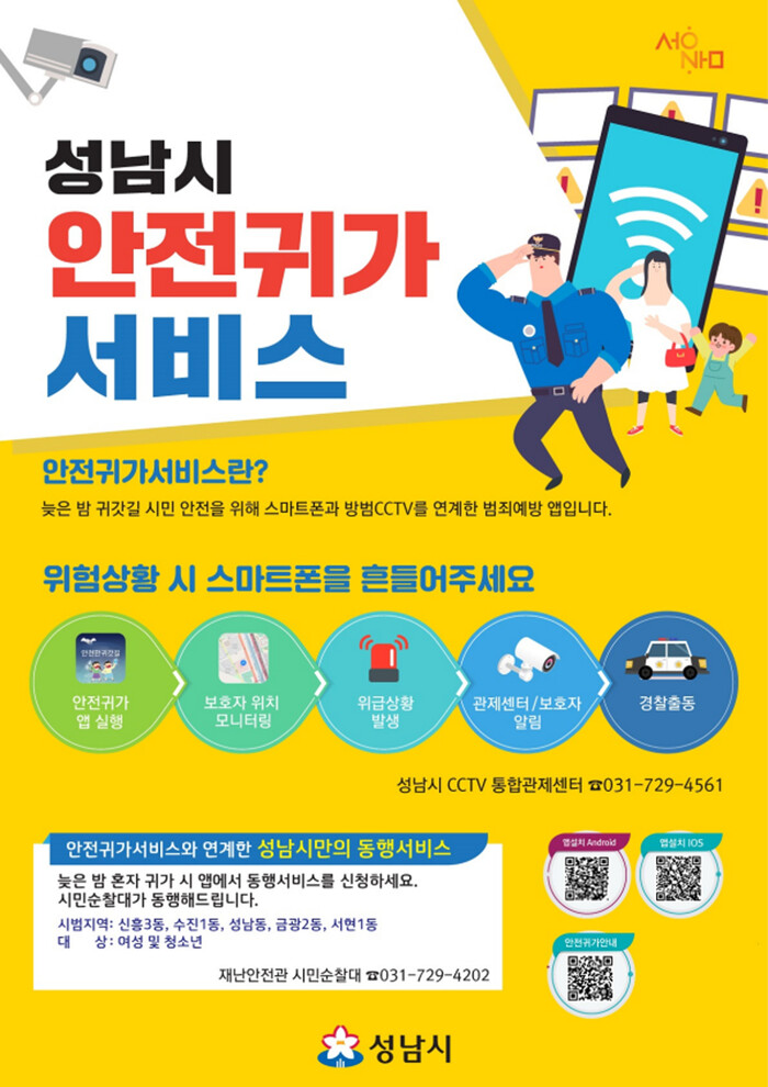 이 서비스는 ‘안전귀가’ 앱을 설치한 사용자가 위험 상황에 직면했을 때 스마트폰을 흔들거나 위급상황 버튼을 누르면 현재 위치가 성남시청 8층 CCTV 통합관제센터와 지정된 보호자에게 자동으로 전송되는 구조다.