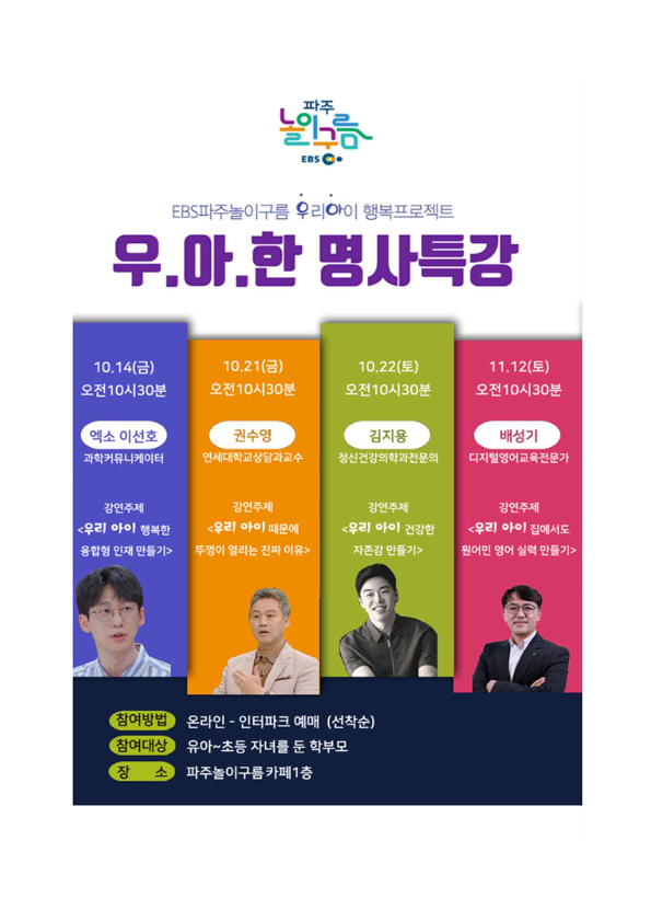 ‘우.아.한 명사특강’은 파주놀이구름 위탁 운영사인 EBS에서 지역사회 환원의 일환으로 10월 14일부터 11월 12일까지 추진하는 지역주민 대상 무료 강연이다.