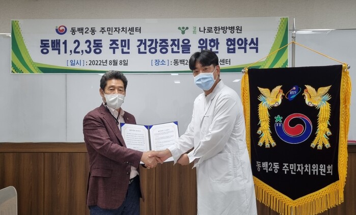 [로컬세계=김병민 기자]경기 용인특례시 기흥구 동백2동은 동 주민자치센터(주민자치위원장 이무섭)와 경희나로한방병원(원장 이수성)이 의료서비스 지원 협약을 체결했다고 12일 밝혔다.