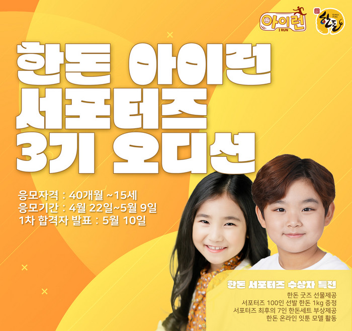 한편, ‘한돈&아이런 서포터즈’는 40개월부터 15세 이하라면 누구나 응모할 수 있으며, 저스트오디션 홈페이지에서 22일부터 신청 가능하다.