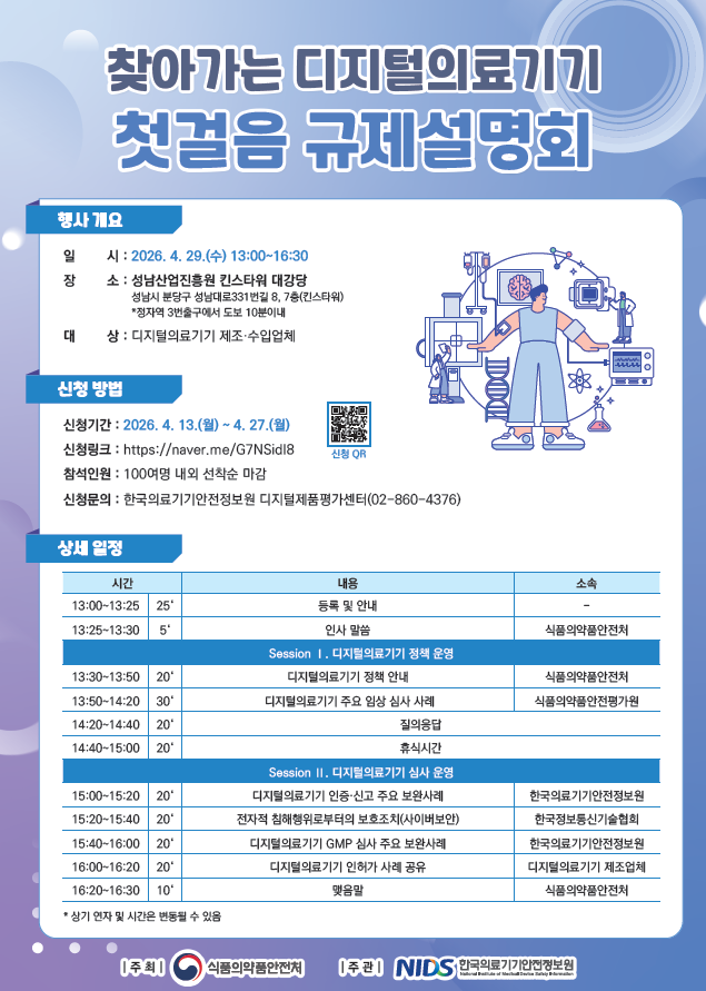 설명회에서는 사전 수렴한 질의를 바탕으로 현장에서 기업들이 가장 어려움을 겪는 ▲디지털의료기기 임상시험 ▲전자적 침해행위 방지 및 보호조치 ▲디지털의료기기 GMP 심사 등 핵심 규제 항목을 중심으로 맞춤형 안내가 이뤄진다.