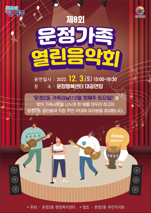 [로컬세계 = 이영원 기자]제8회 운정가족 열린음악회가 12월 3일 운정행복센터 대공연장에서 개최된다.