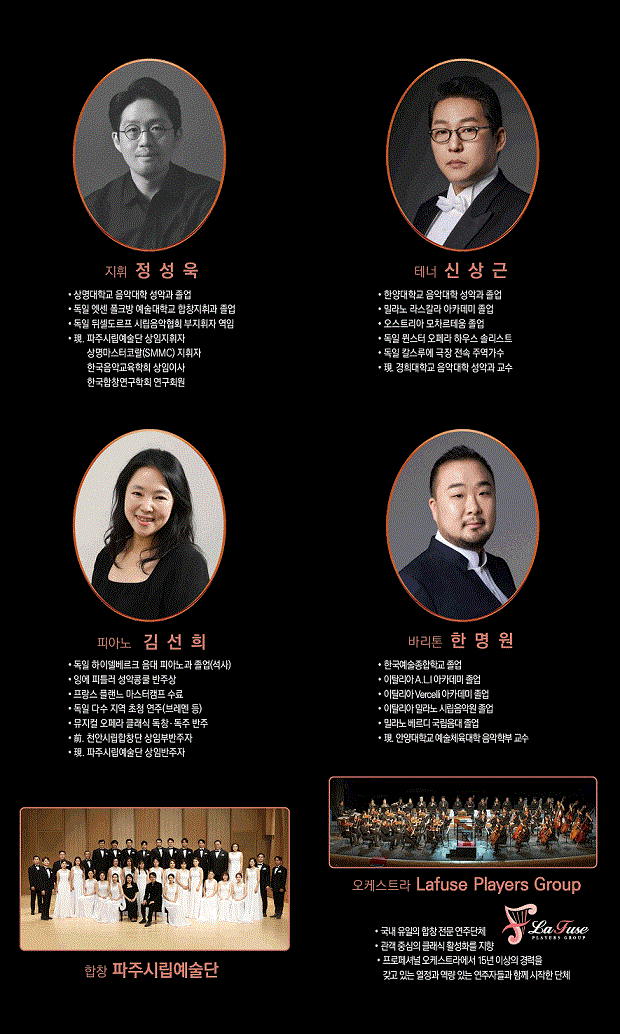 국내 유일의 합창 전문 연주단체 ‘라퓨즈 오케스트라단’의 연주와 함께 스페셜 게스트로는 독일 칼스루에 극장 전속 주역가수로 국제무대에서 널리 이름을 알리고 있는 테너 신상근과 조수미&위너스 오페라 갈라콘서트 등 다수 콘서트에서 주역가수로 활동 중인 바리톤 한명원이 함께해 풍성한 공연을 안겨줄 것으로 기대된다.