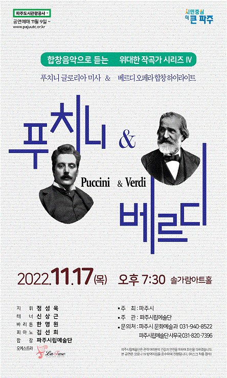 [로컬세계 = 이영원 기자]경기 파주시 시립예술단에서는 오는 17일 운정 솔가람아트홀에서 ‘합창음악으로 듣는 위대한 작곡가 시리즈Ⅳ, 푸치니&베르디’를 기획공연으로 선보인다.