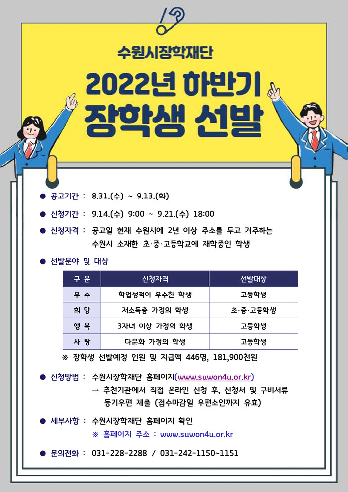 신청 서식·선발 일정 등 자세한 내용은 수원시장학재단 홈페이지 ‘열린마당→공지사항’에 게시된 ‘2022년도 하반기 장학생 선발계획 공고’에서 확인할 수 있다.